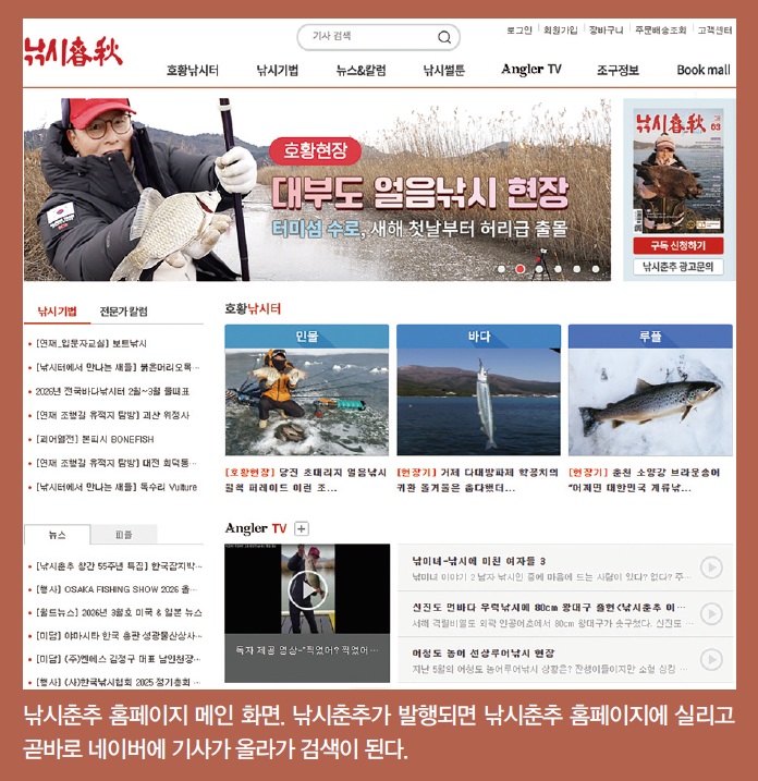 현재 낚시춘추는 ‘낚시춘추’라는 동명의 홈페이지를 운영 중이며 매월 책자에 실린 기사들이 홈페이지에 업로드 됩니다. 그와 동시에 네이버에도 자동으로 제공되는 구조입니다.