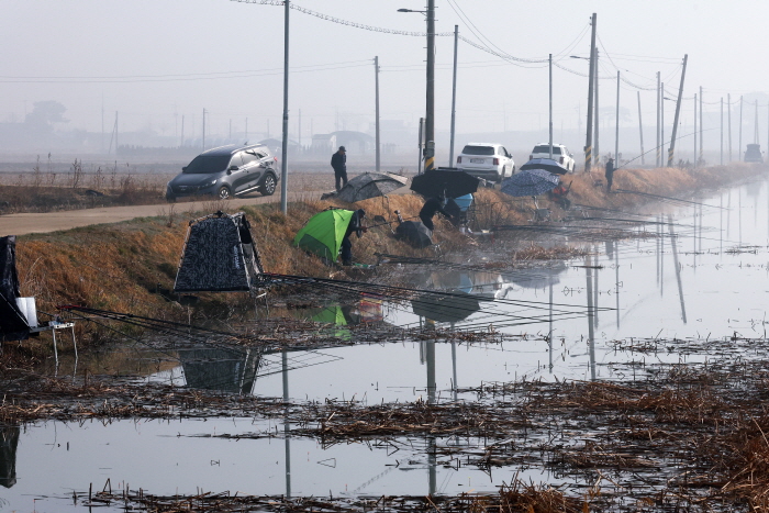 조훈희 씨는 읍내리수로 수문 옆 상류 쪽에 자리를 잡고 있었다. 수문을 기준으로 교동도 선착장 방향이 상류, 반대편이 하류인데 낚시하기 좋아 보이는 자리는 아니었다. 회원들은 대부분 하류 연안에 나란히 앉았고 상류에는 조훈희 씨와 낚시인 2명이 전부였다. 수문 상류는 연안에 삭은 갈대가 많아 한눈에 봐도 바닥이 지저분하고 물색이 너무 탁했다. 조훈희 씨는 “회원들도 모두 이 자리를 지나쳤습니다.