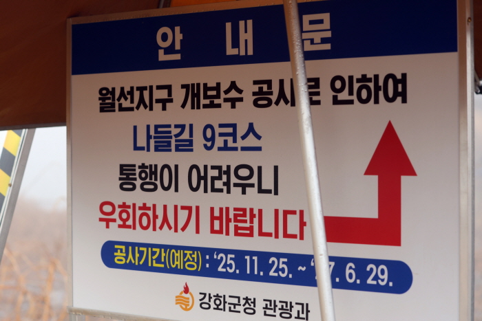 월선지구 개보수 공사 안내문. 27년 6월 29일까지 공사가 진행되므로 나들길 9코스는 이용할 수 없다.