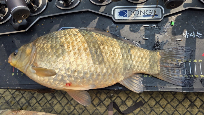 이날 나온 붕어는 모두 비늘이 깨끗했고 황금색을 띄고 있었으며 체구까지 높은 정말 잘생긴 붕어들이었다. 이 3마리는 모두 정면의 맨땅 아니, 바닥이 말풀인 곳의 언저리에서 나온 놈들이었다. 그 사이 옆자리의 홍순진 씨도 34cm의 월척을 낚는 등 몇 마리의 붕어를 낚아내고 있었다.
