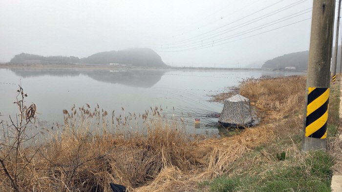 지난 3월 26일 새벽 5시에 집을 나서니 아직도 찬바람이 불어오고 있었다. 부지런히 달려 당진 삼봉지에 다다르니 앞이 보이지 않을 정도로 짙은 안개가 끼어 있었다. 자주 다니던 길이지만 앞이 보이지 않아 조심조심 기어가듯 찾아 들어가야 했다. 약 10여 분이 지난 후에야 목표했던 지점의 포인트에 도착했다. 그곳에는 전날 오전부터 이곳을 찾아 낚시하고 있는 홍순진 씨가 필자를 기다리고 있었다. 짙은 안개 속이라 포인트는 잘 보이지 않았지만 우선 좌대부터 펴고 낚시 준비를 했다. 농번기가 되기 전에 완공하려는 듯 바로 옆에 양수장 증축 공사가 마무리 단계에 들어서고 있었다. 그 때문인지 삼봉지의 저수율로는 최저인 50% 정도였다.