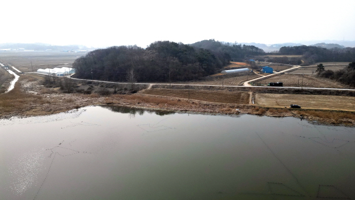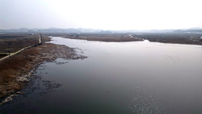 드론으로 촬영한 삼봉지. 제방을 기준으로 하류가 해창지다.