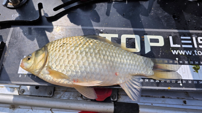오전 9시가 지나자 안개가 옅어지고 바람도 약해져 낚시하기에는 좋았다. 앞쪽 뗏장수초 속에서는 무언가 산란하는 모습이 이따금 보였지만 아직 본격적인 산란은 아닌 듯했다. 오전 9시30분이 지날 무렵, 정면에 세워져 있던 찌가 살짝 올라 온 후 옆으로 끌려갔다. 챔질하니 힘도 쓰지 않고 순순히 딸려 나온 붕어는 28.5cm의 체구 좋은 준척 붕어였다. 그리고 잠시 다시 한 번 그 낚싯대에 입질이 있었고 두 번째 나온 붕어도 고만고만한 쌍둥이었다. 오전 11시 무렵 31cm 월척 붕어를 추가했다.