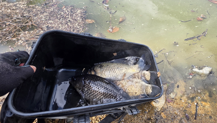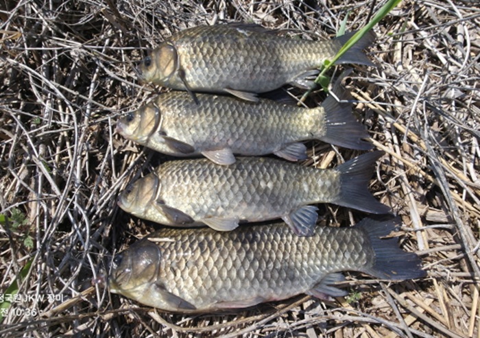 낙산지에서 낚은 붕어를 최근 물빼기를 했던 저수지에 이식했다.