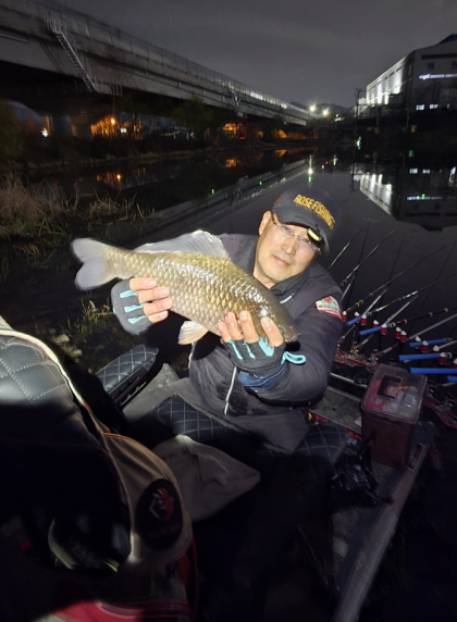 다시 회사로 출근해 오후 5시에 근무를 마치고 낙산지로 들어갔다. 세 번째 밤낚시 도전이었다. 그런데 이날은 소문을 듣고 왔는지 다른 낚시인들도 많이 들어와 있었다. 이에 남들이 잘 찾지 않는 좌안 중류로 자리를 이동했다. 길이 없는 늪지라 장화를 신지 않고는 진입이 어려운 자리였다. 오후 6시30분경 낚시 장비를 모두 옮긴 뒤 다시 밤낚시에 돌입했다. 이날은 옥수수를 주력 미끼로 썼다. 그러나 피곤하고 추위도 엄습해 새벽에 잠시 눈을 붙였다가 4시부터 낚시를 시작했다. 이때부터는 계절 관계없이 집중해야 할 시간이기 때문이다. 그리고 아침 5시경 기다렸던 입질이 들어왔다. 올려보니 무려 41cm였다.