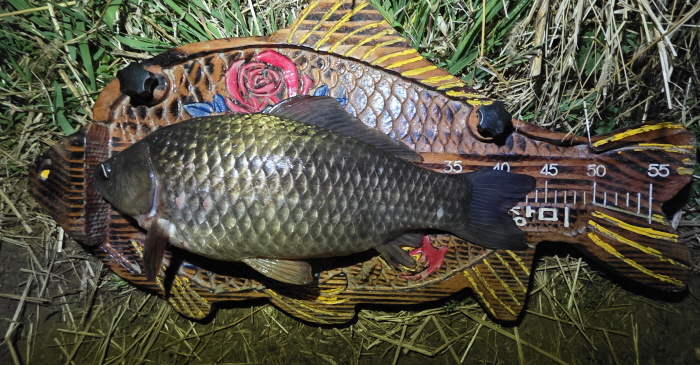 밤 9시45분경 첫 입질을 받았다. 랜딩 해 물 밖으로 꺼내어 계측해보니 44cm였다. 첫 입질에 대물을 낚아낸 터라 큰 기대감이 들었다. 옆 회원들도 필자의 대물 붕어를 목격하고는 더욱 열심히 낚시했다. 대물터 치고는 이른 시간에 입질이 온 터라 기대감은 두 배로 늘어난 듯했다.