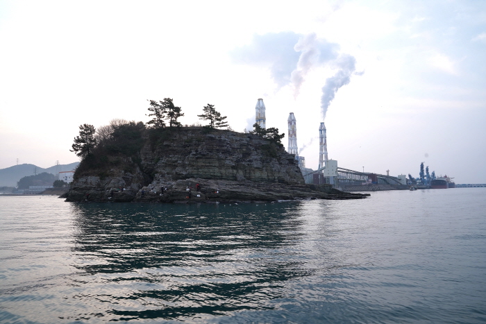 삼천포 내만 최강의 호황터로 떠오른 중바위. 뒤편에 화력발전소 건물과 물양장 포인트가 있다.