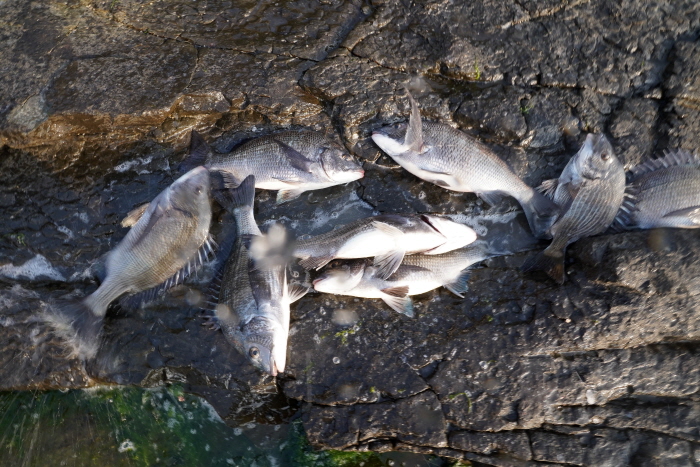 이날 우리는 물양장에서 오후 4시까지 낚시했지만 세 팀이 각각 1마리씩의 감성돔을 낚는 데 그쳤다. 조금물때를 향한 물때 탓인지, 단순 조황 기복인지는 알 수 없었다. 반면 오전에 출조하며 봤던 중바위는 대호황이었다. 중바위는 물양장에서 불과 2~3분 거리로 두 곳 모두 삼천포화력발전소와 붙어있는 포인트들이다.