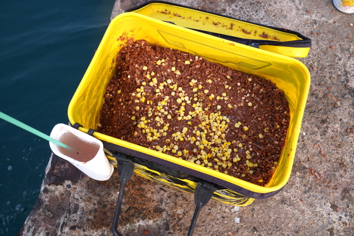 밑밥 위에 흩부린 옥수수. 잡어가 많을 때 미끼로 사용한다.
