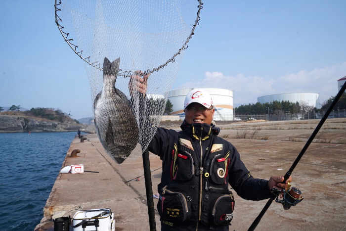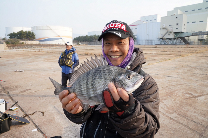 부산에서 온 낚시인도 물양장에서 감성돔을 낚았다.