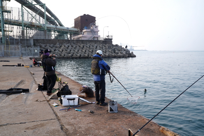 물양장 포인트는 지난 2~3년간 한시적으로 출입이 어려웠었다. 발전소에 물자를 내리는 작업과 공사가 꽤나 오래 진행됐던 것 같았다. 자연스럽게 밑밥이 덜 들어가게 됐고 조황도 덩달아 떨어졌다고 한다. 최근 다시 개방됐지만 수온이 낮은 영등철인 데다가 조황도 부진해 인기가 크게 떨어졌었다. 다행히 며칠 전부터 예년 조황을 회복 중인 듯했다. 참고로 과거에는 텐트를 치고 야영낚시도 했지만 현재는 텐트 설치는 불허하고 있다.