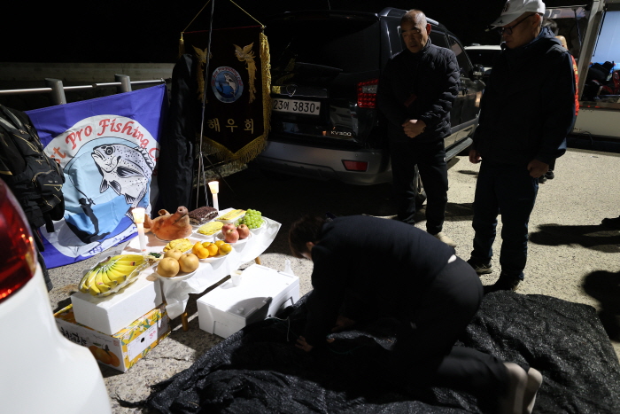 15일 오전 3시. 전남 해남군 남창리에 있는 달량진낚시에 들러 승선명부를 작성 후 해남 남성항에 도착했다. 현장에는 이미 많은 낚시인들이 출조를 준비하고 있었고 대부분 추자도로 출조했다. 출항 전 해우회 회원들은 올해 첫 정기 출조를 기념하는 고사를 지냈고 오전 4시30분에 강바다호에 승선해 소안도로 나갔다.