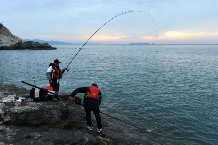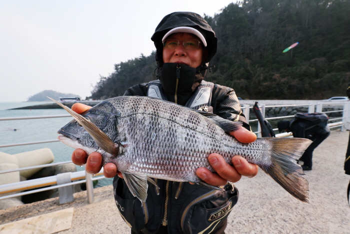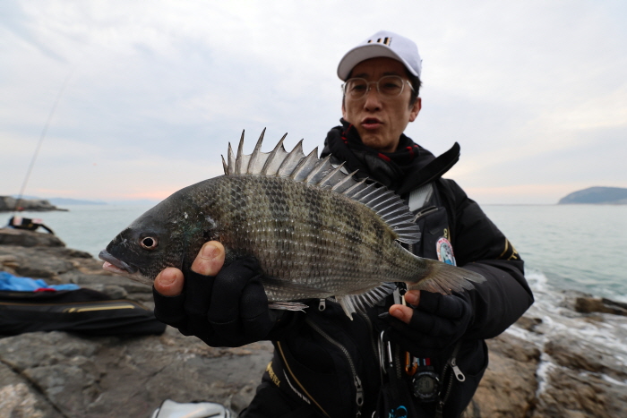 서둘러 김태환 씨와 내가 캐스팅을 이어갔고 김태환 씨가 먼저 입질을 받아 이번에는 37cm 감성돔을 올렸다. 입질은 그치지 않았는데 정용선 씨가 한 마리를 추가했고 나도 한 마리를 낚을 수 있었다. 씨알은 4짜급도 있었지만 30cm 중반이 대부분. 입질한 자리는 여러 곳이었는데 발판이 나오는 곳이라면 어디든 입질이 들어오는 상황이었다.