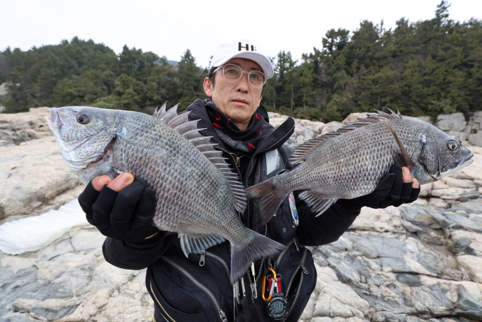 “오전에 낚은 감성돔 씨알이 굵습니다.” 해우회 김태환 회원이 소안도 몽돌밭자리에서 낚은 감성돔 두 마리를 보여주고 있다.