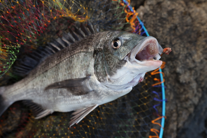 참갯지렁이를 물고 나온 48cm 감성돔.