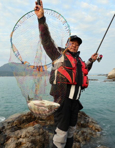 정용선 씨가 3번째 감성돔을 올리자 정일 씨가 뜰채를 대고 있다.