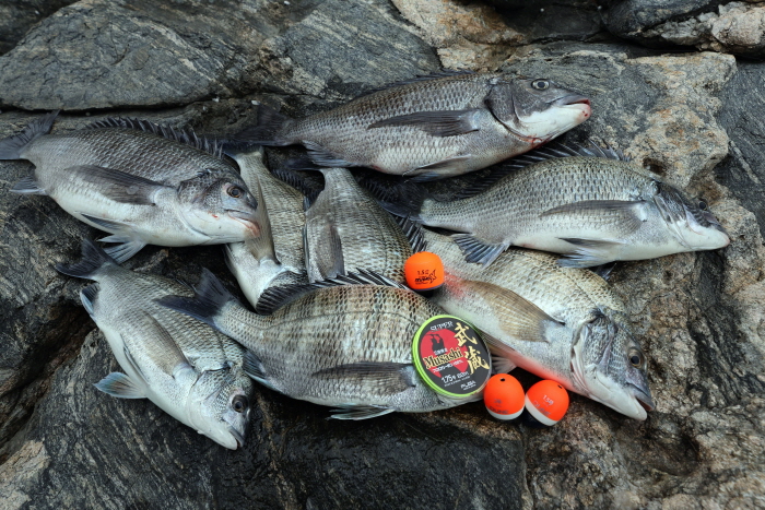 취재팀이 거둔 감성돔 조과. 총 8마리를 낚았다.